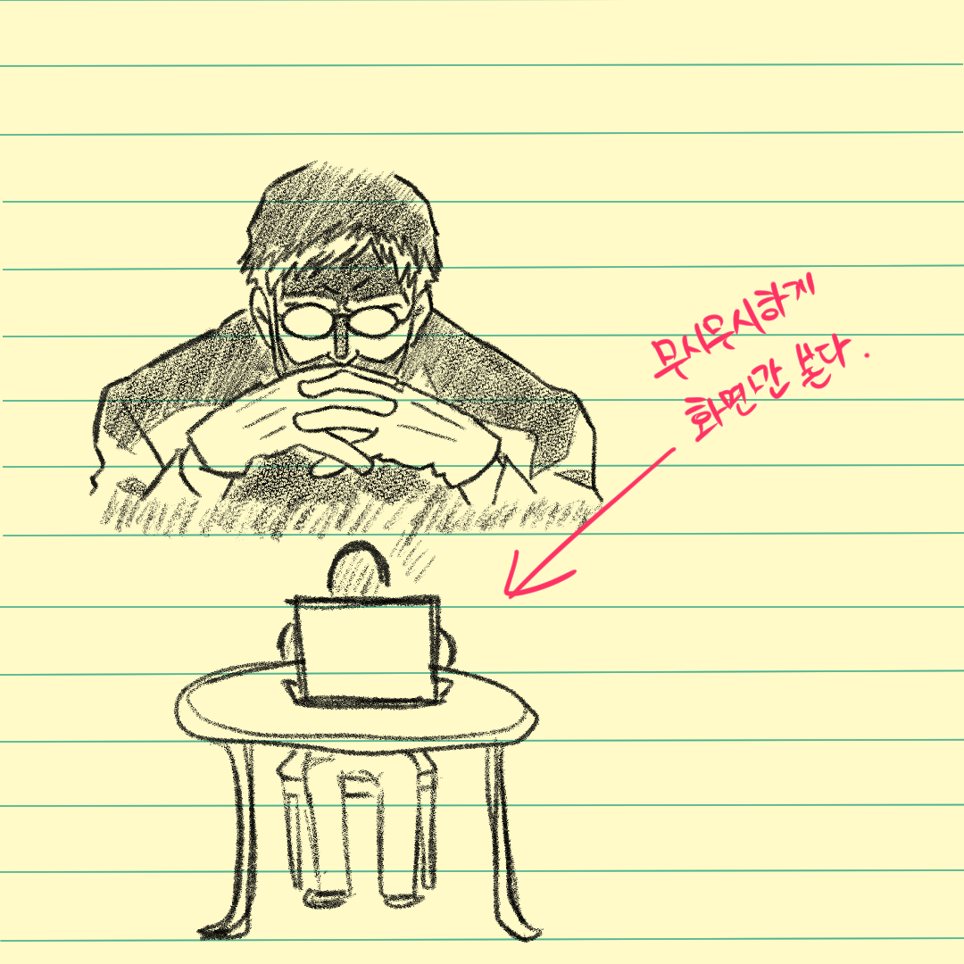 카페. 인디고 옆 테이블에 중년 남성이 노트북을 펼쳐두고 있었습니다.