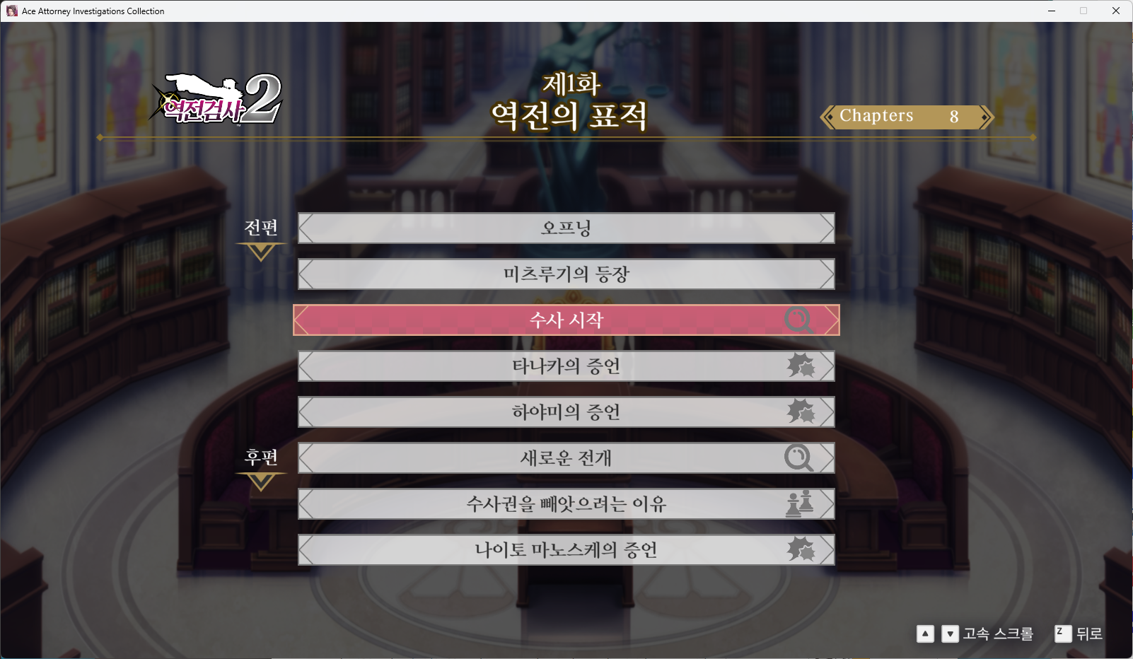 - [역전검사2] - [제1화 역전의 표적] - [수사 시작] 챕터로 이동합니다.