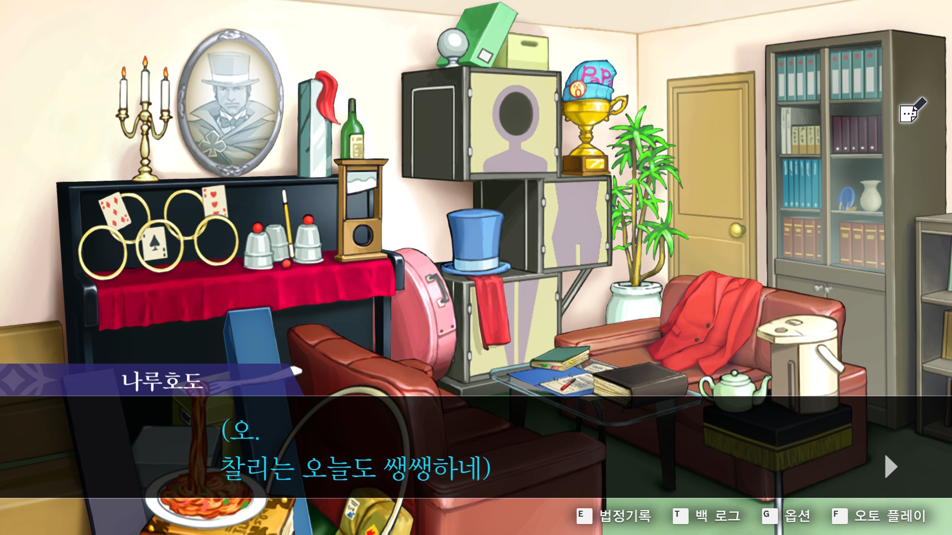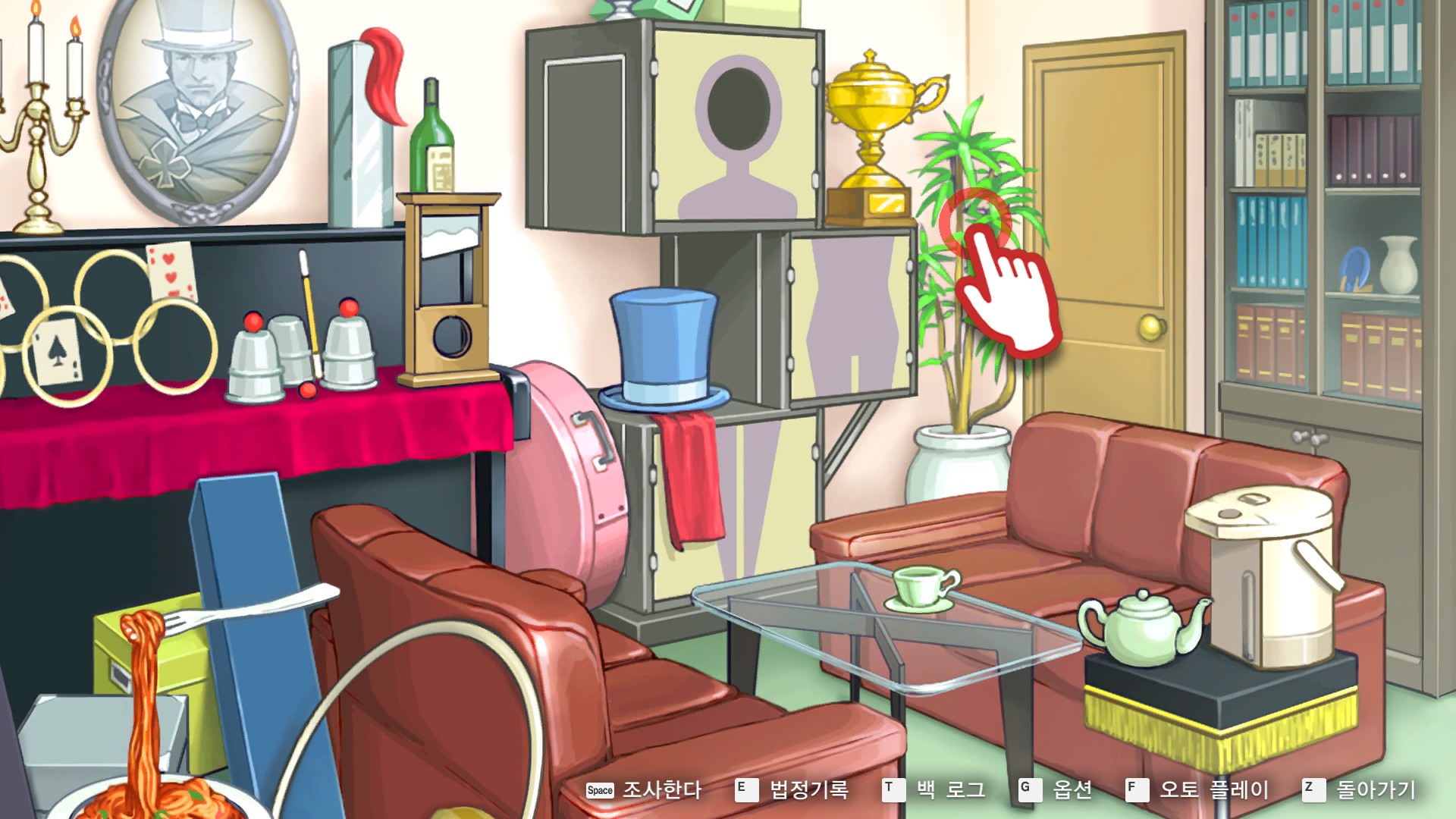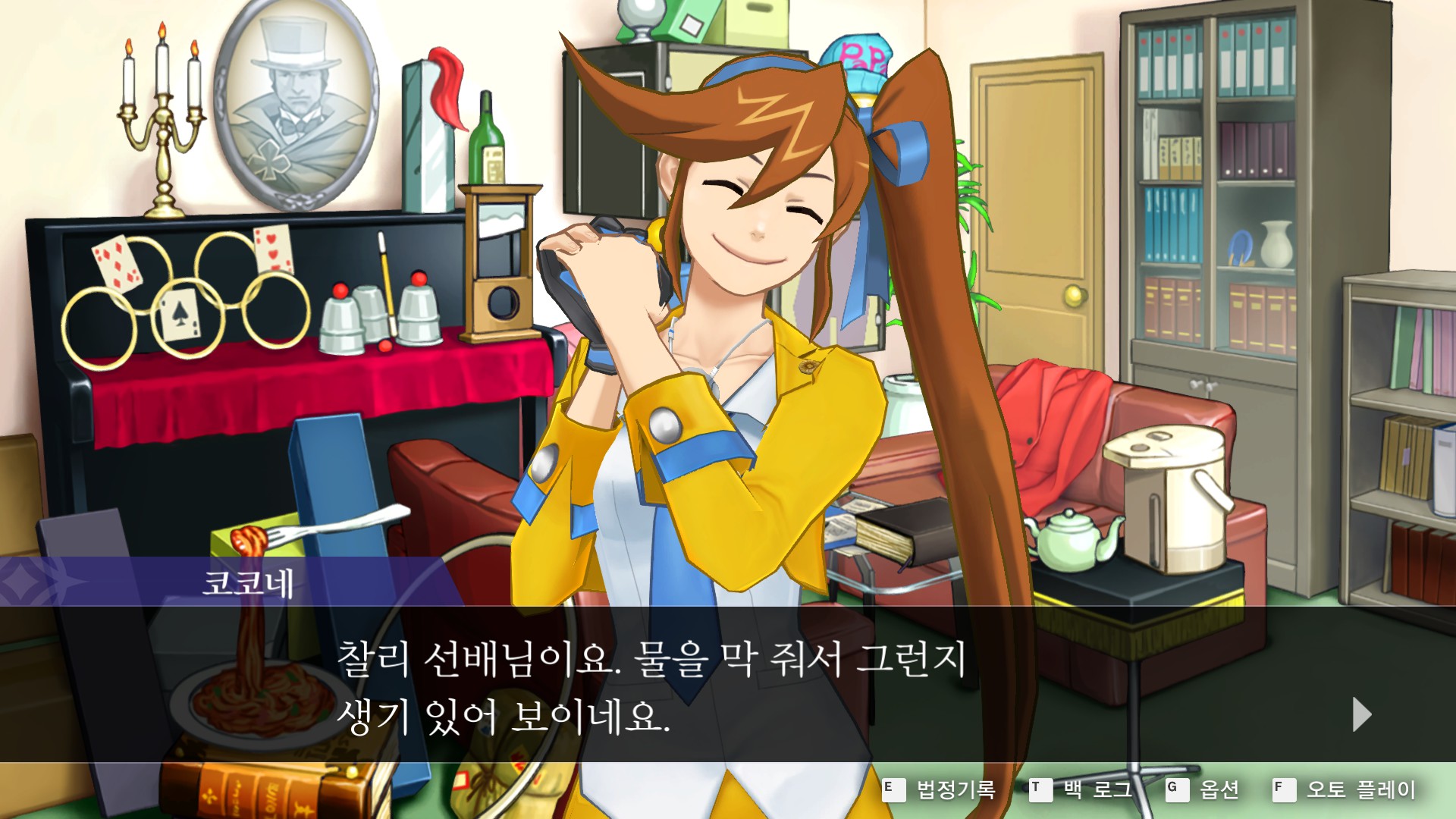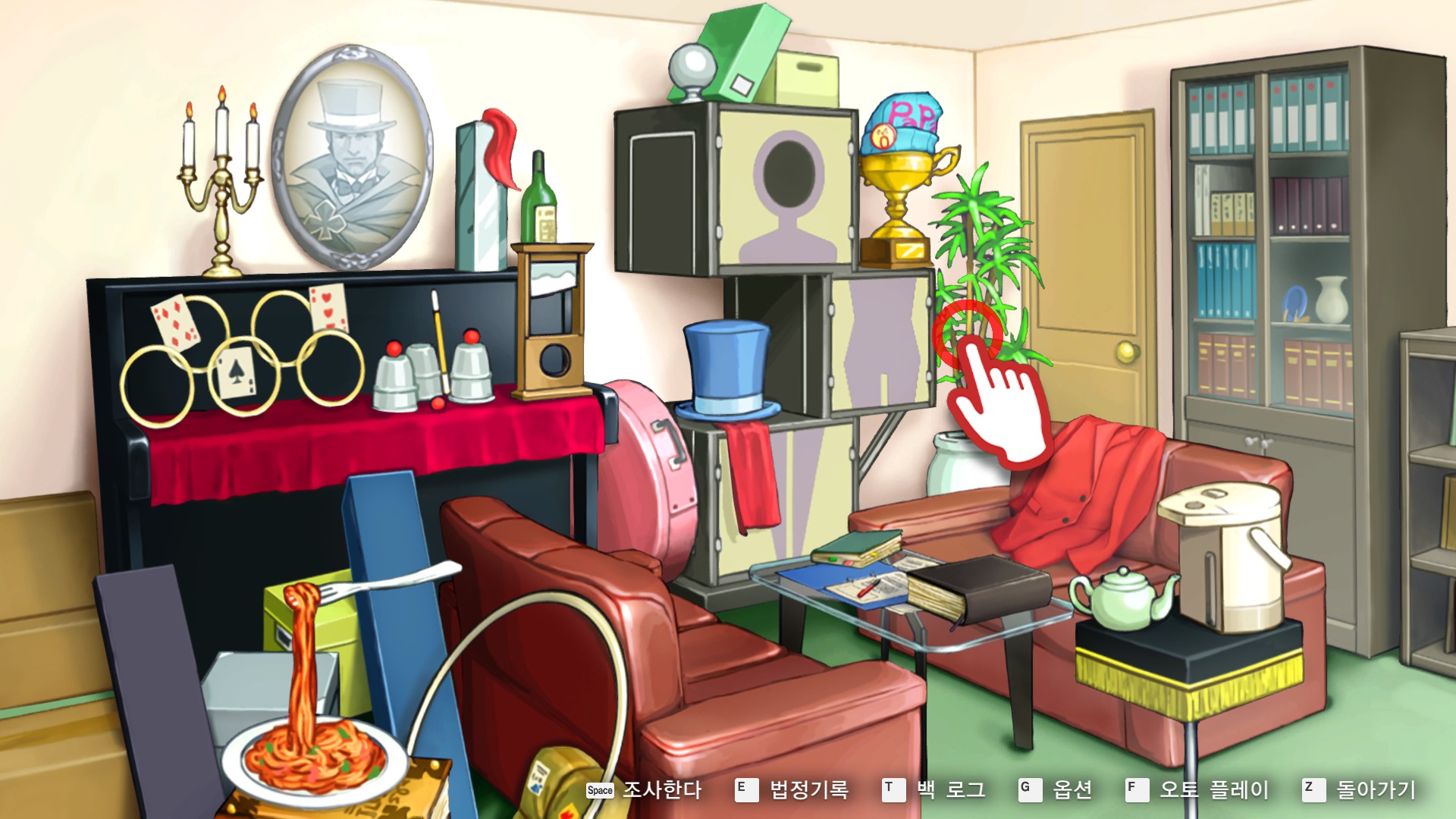 - 역전재판6 > 특별편 > 탐정 1일차에 사무소에서 관엽식물 찰리를 조사한다.