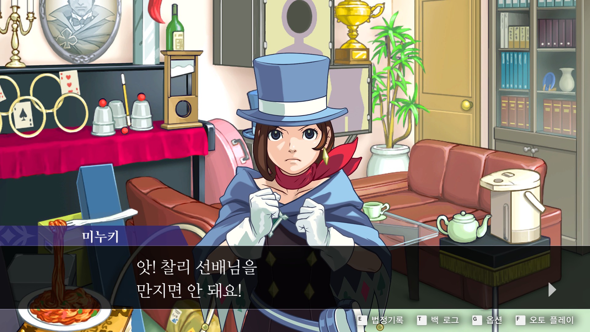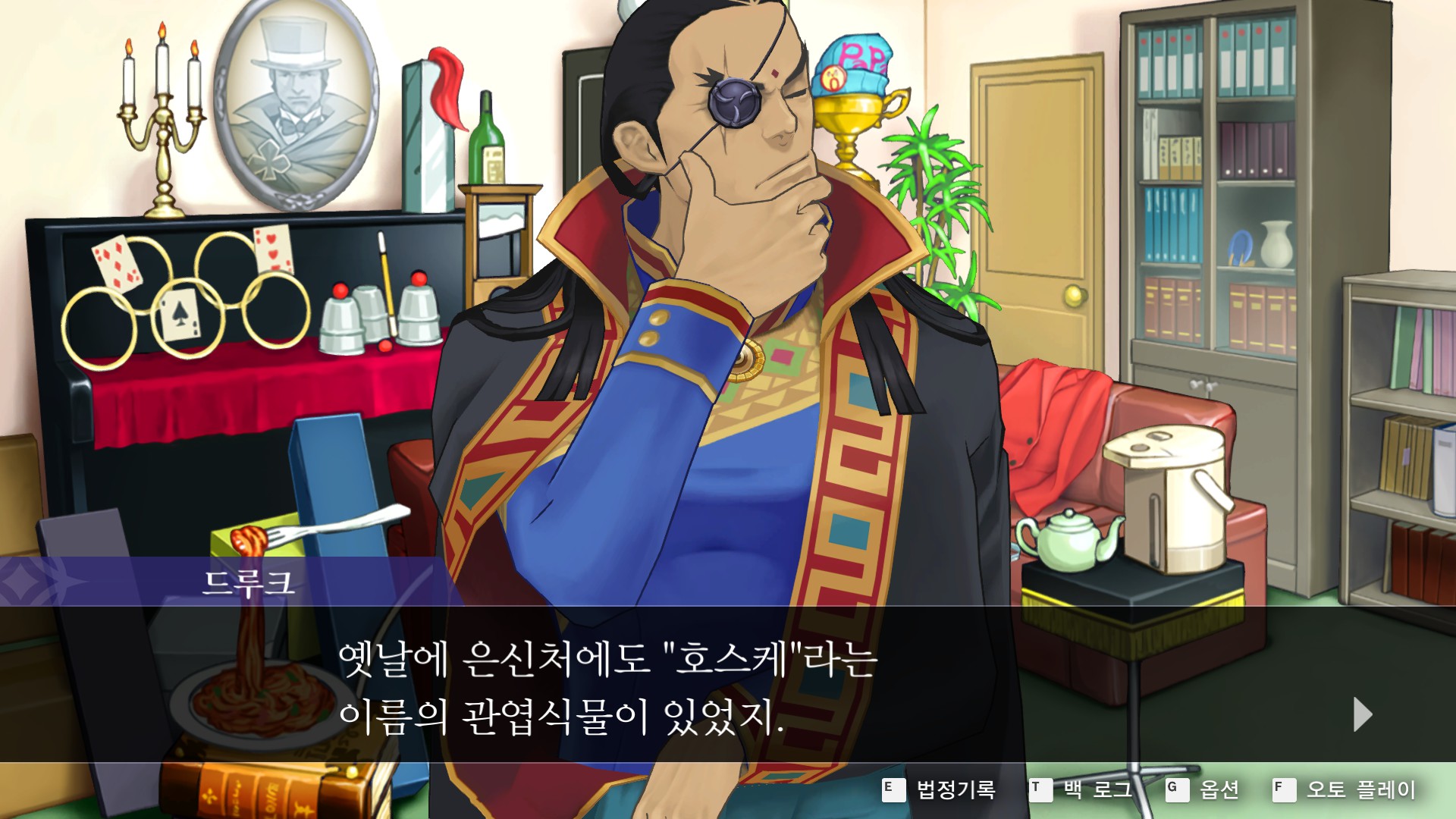 8. 역전재판6 > 특별편 > 탐정 1일차 시작 챕터로 이동해 관엽식물을 조사합니다.