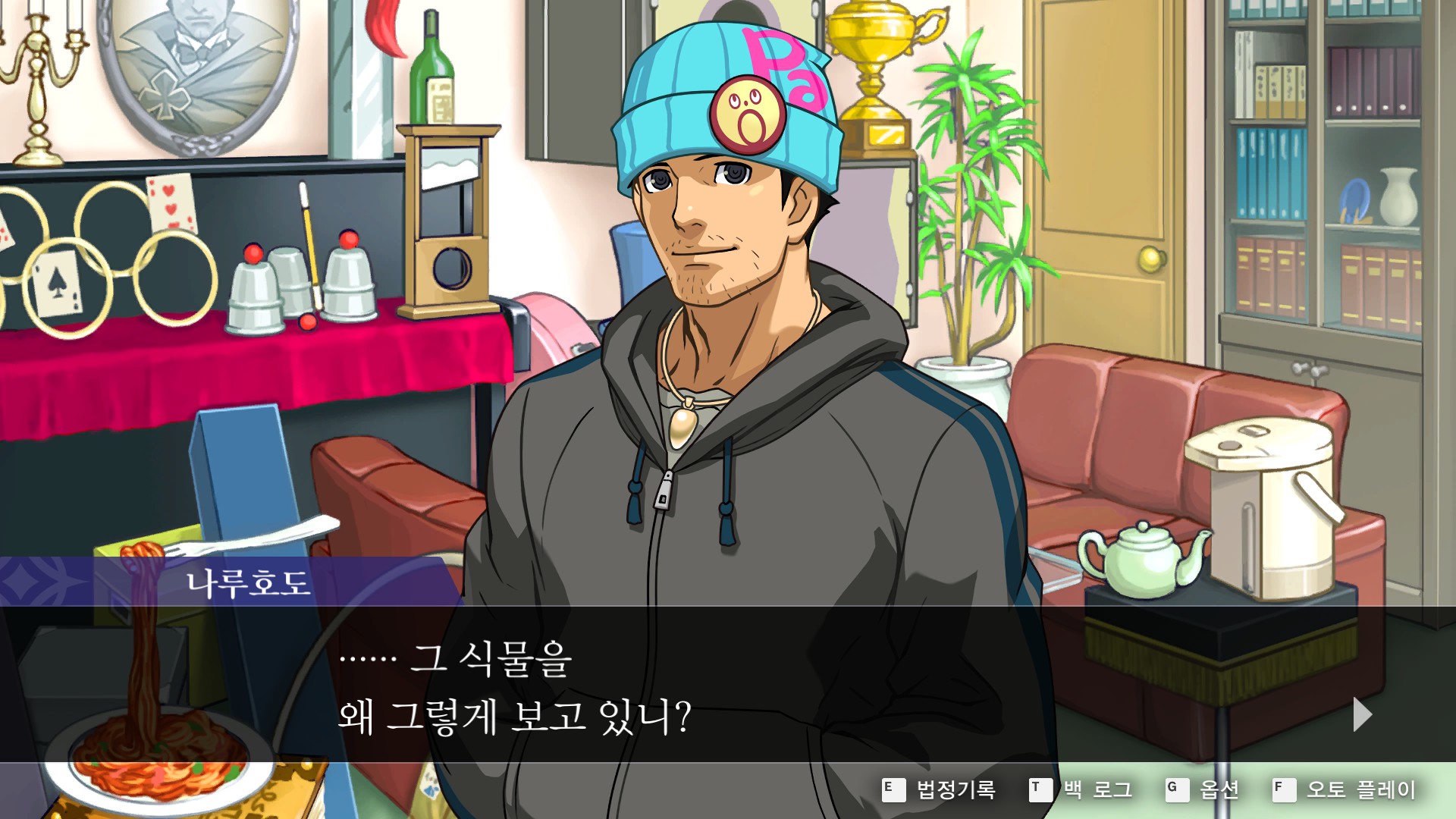 - 역전재판4 > 제3화 > 탐정 2일차에 사무소에서 관엽식물 찰리를 조사한다.
