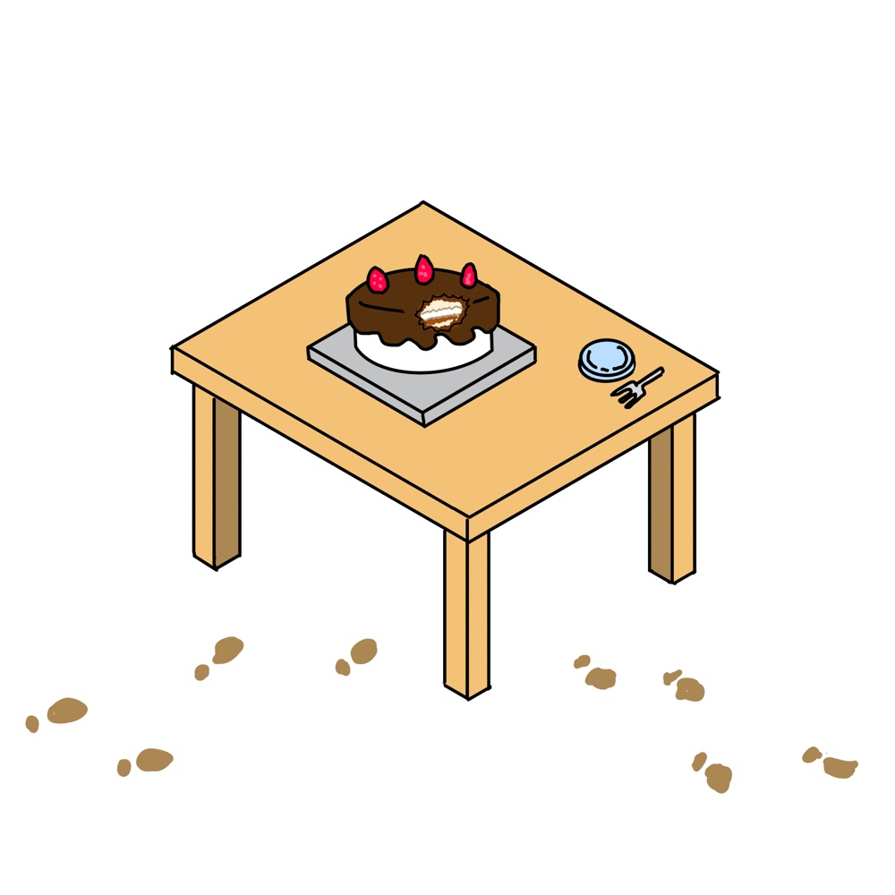 오후 간식으로 아껴둔 조각 케이크가 감쪽같이 사라졌습니다! 현장에 있었던 용의자는 총 세 명. 바닥에 남겨진 결정적인 '흔적'을 보고 범인을 지목해 주세요. 정답은 내일 공개됩니다.