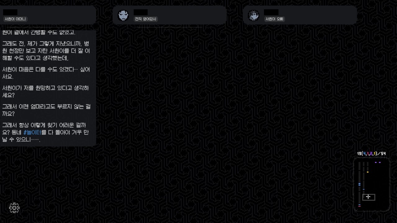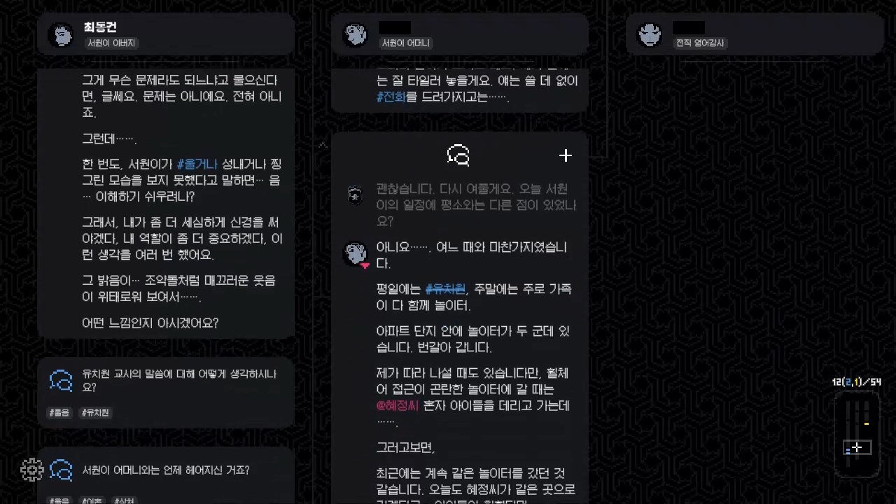 이제 점점 진술과 진술자가 늘어나기 시작합니다. 진술은 아까처럼 해시태그로 찾아 열 수 있고, 계정태그(@)를 클릭하면 진술자가 추가됩니다. 아직은 한정적인 정보로 인해 모든 진술자의 정보가 나오진 않습니다. 일단 구분할 수 있을 정도이니 우선은 진술을 최대한 뽑아내는 것에 집중합시다. 진술이 많아지면 점점 스크롤도 길어집니다. 이때부터, 오른쪽 아래의 썸네일을 보고 맞춰가며 이동합시다. 대화는 점점 길어질 것입니다.