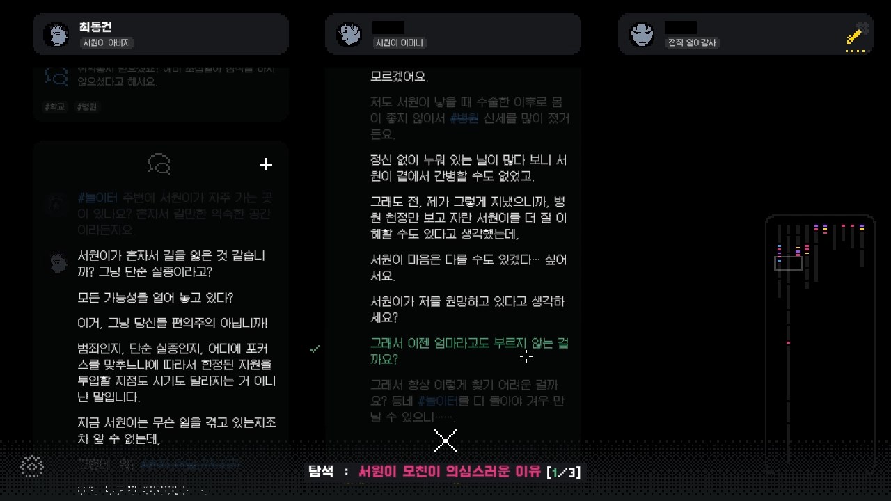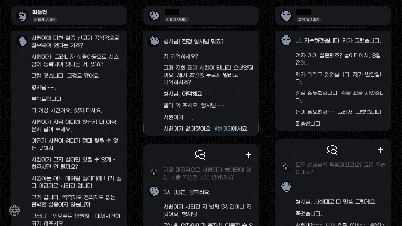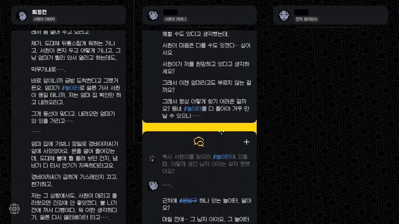 초반 인트로가 지나가면 조금씩 진술이 열립니다. 파란색 해시태가 반짝거릴 겁니다. 계속 클릭하여 진술을 모으세요. 충분히 진술이 모였다 싶으면 이벤트가 중간에 나올 겁니다. 여러 개의 진술이 나타나도, 해시태그 하나에 한 진술이 열립니다. 신중할 필요는 없습니다. 자유롭게 선택해서 충분히 진술을 열어보십시오.