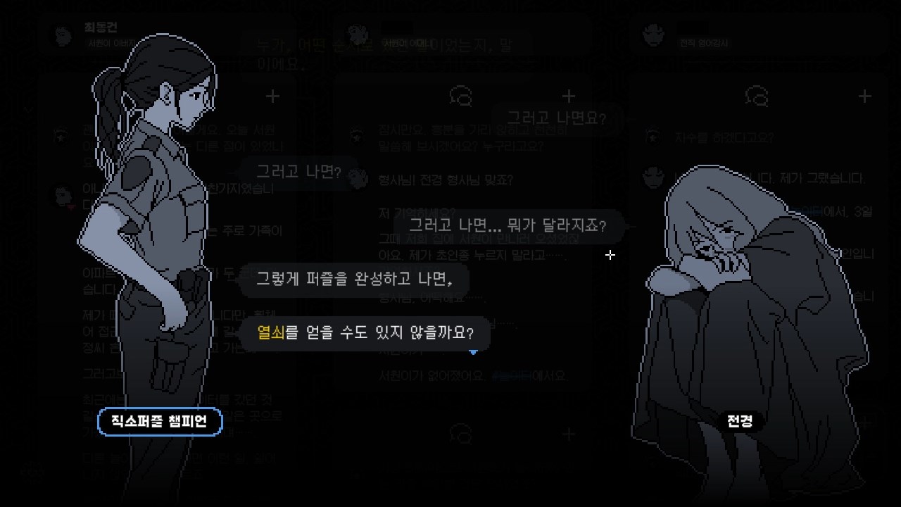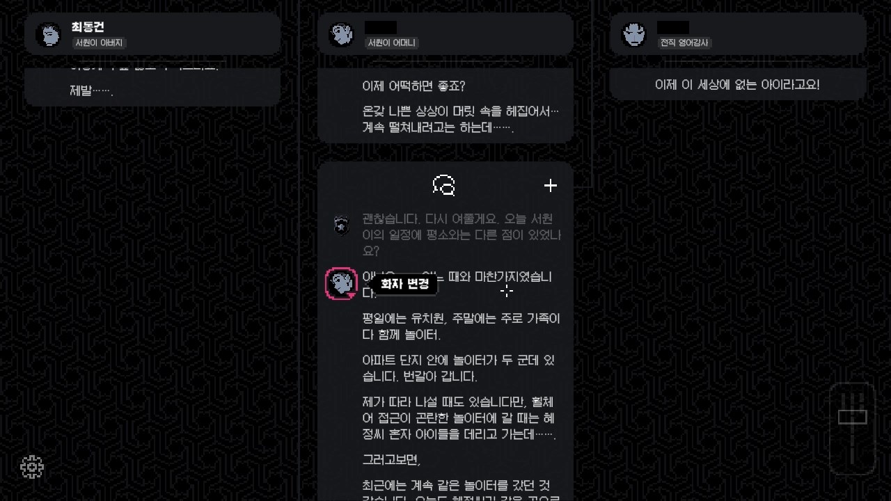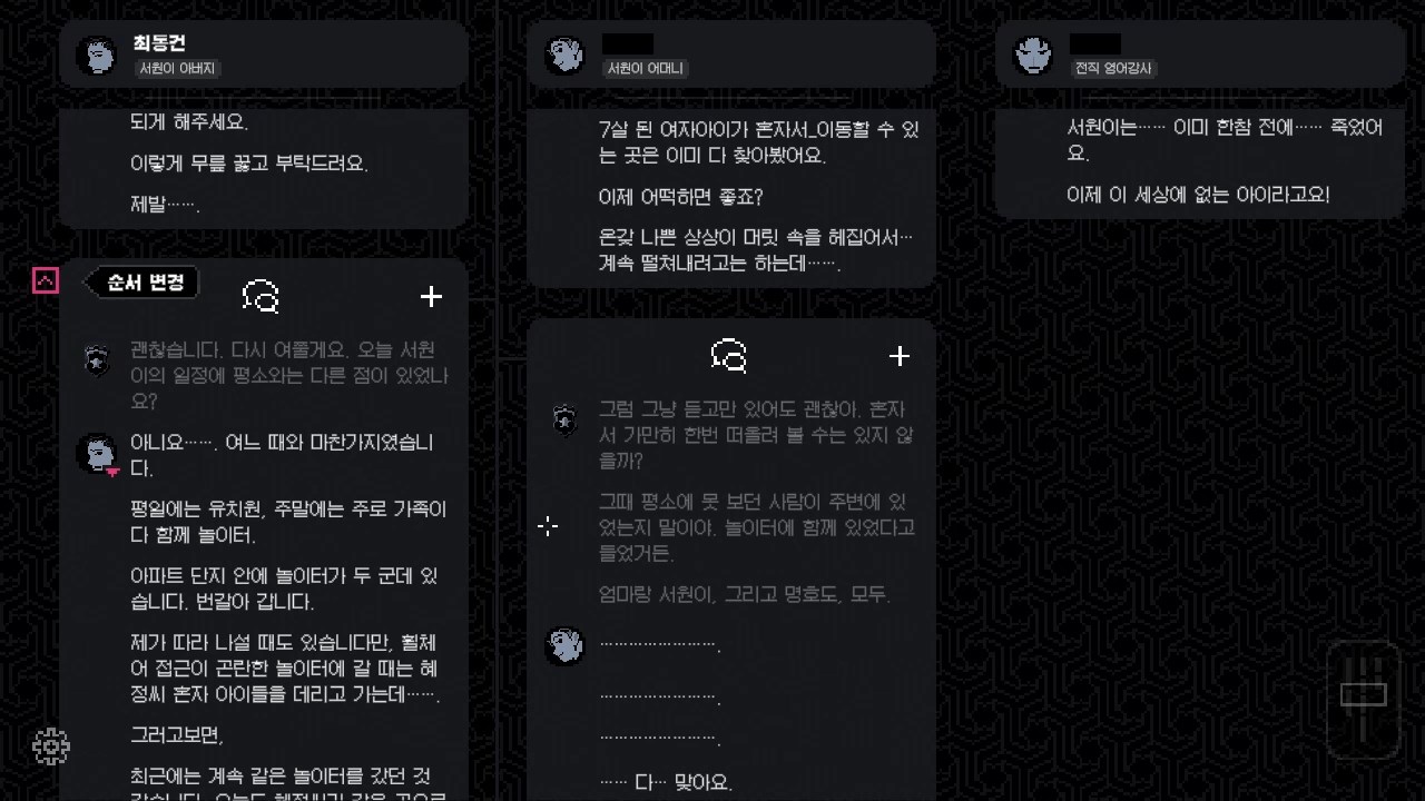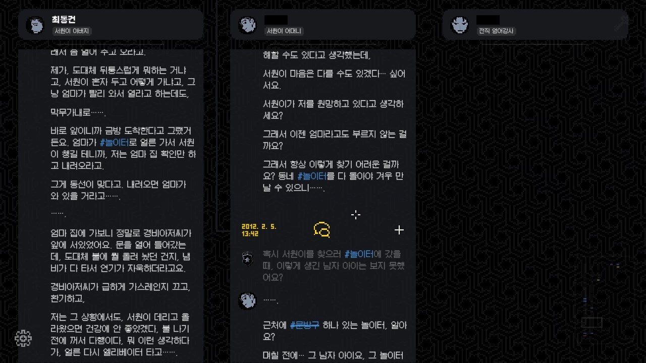 초반 인트로가 지나가면 조금씩 진술이 열립니다. 파란색 해시태가 반짝거릴 겁니다. 계속 클릭하여 진술을 모으세요. 충분히 진술이 모였다 싶으면 이벤트가 중간에 나올 겁니다. 여러 개의 진술이 나타나도, 해시태그 하나에 한 진술이 열립니다. 신중할 필요는 없습니다. 자유롭게 선택해서 충분히 진술을 열어보십시오.