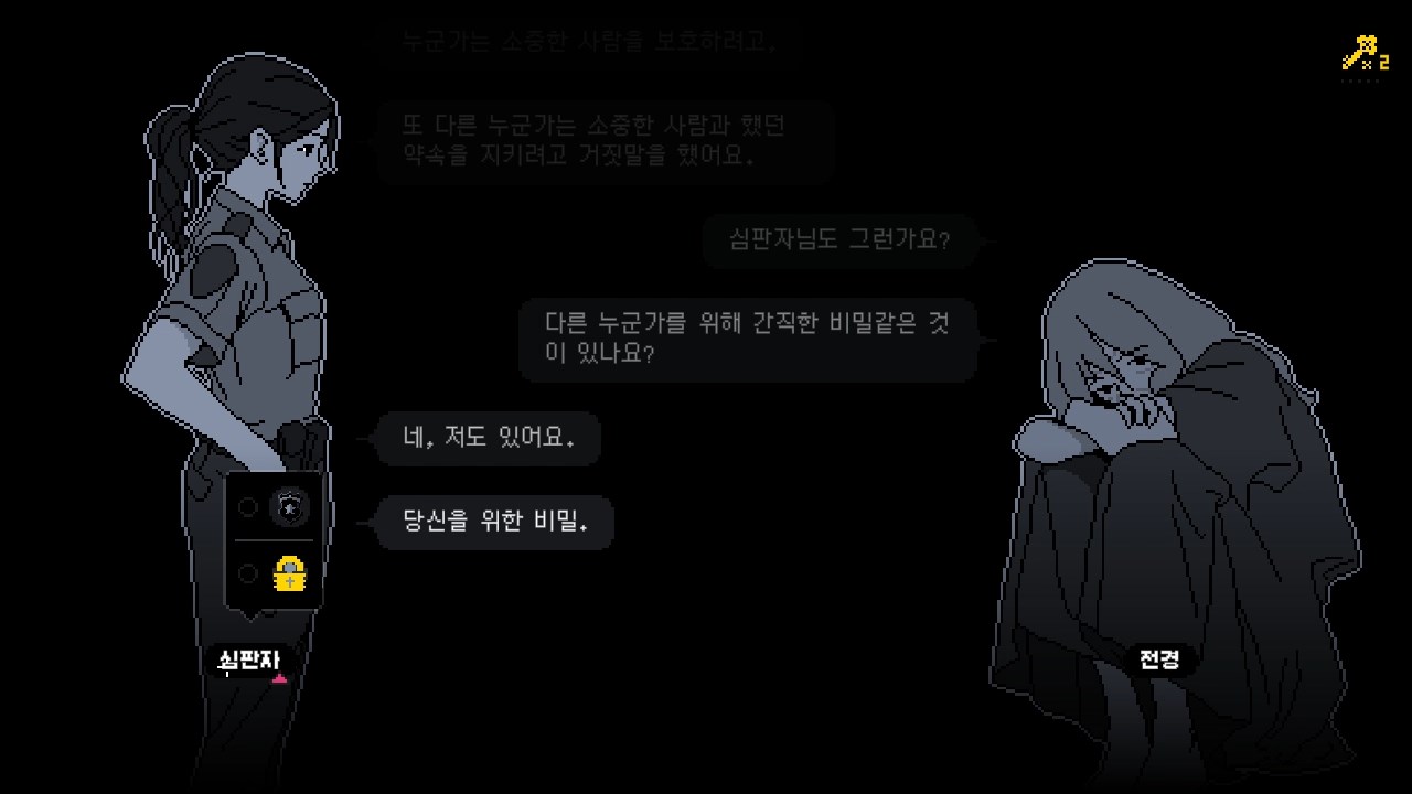 분홍색 자물쇠는 기존의 진술 상의 문장을 통해 단서를 찾아 채택하면 해금되는 진술입니다. 순서는 무작위이며 강력한 스포일러가 될 수 있으니 이 점 주의하시기 바랍니다.