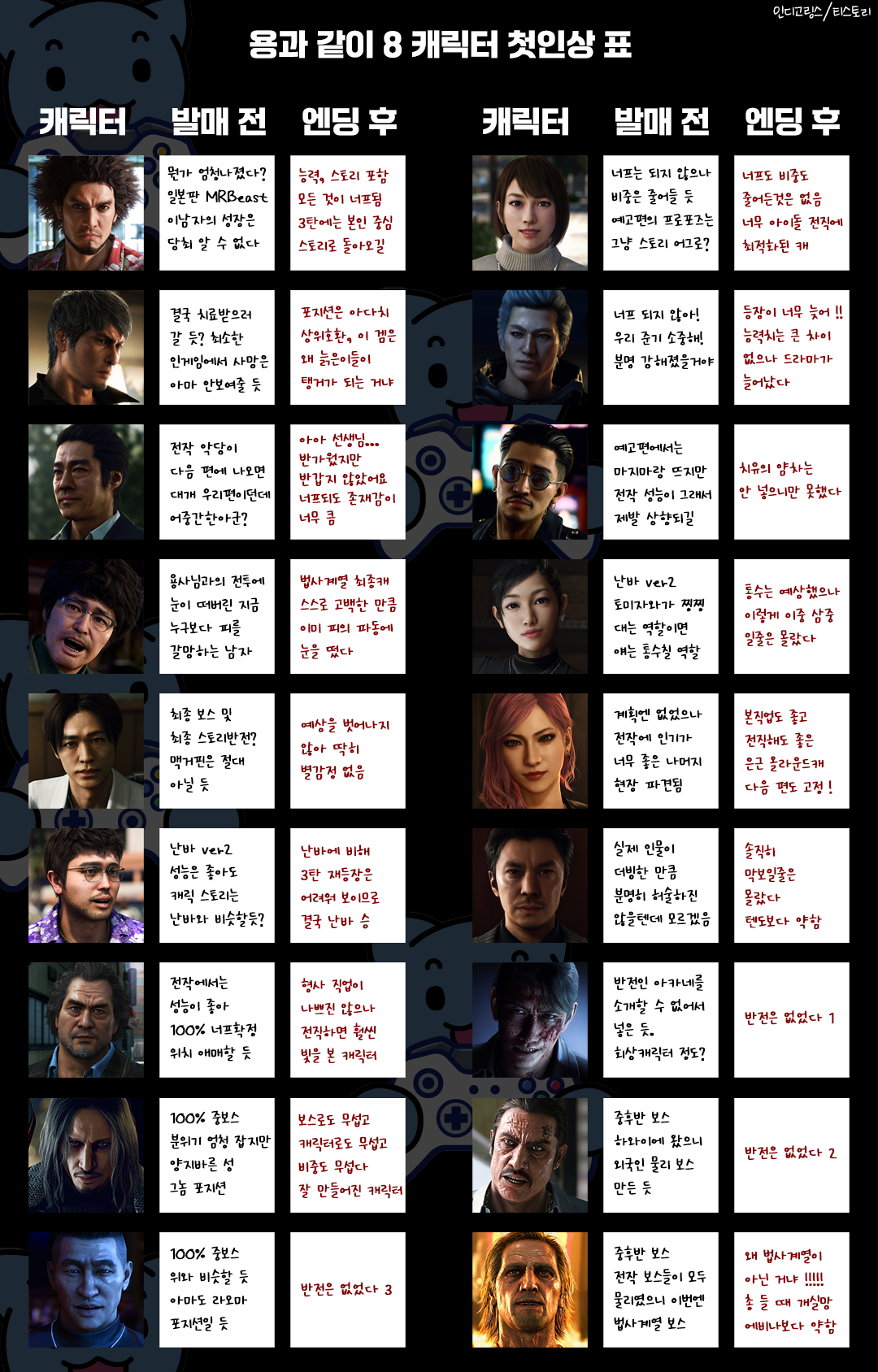 이전에 해보고 싶었던 것 중 하나가, 캐릭터 첫인상 후인상 표인데, 재미삼아 해보려고 합니다.