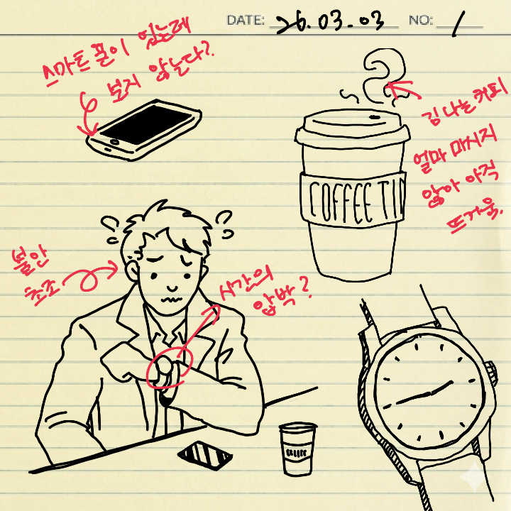 😼: "그렇군. 스마트폰을 놔두고 시계로 시간을 보고 있어."