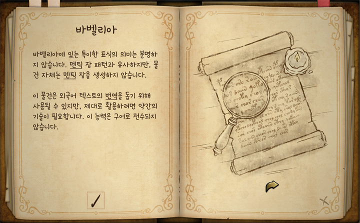 도감 페이지를 넘기다 보면 페이지 아래에 X 표시가 되어 있는 게 있습니다. 해당 아이템을 모두 찾아 선반 위에 올립니다. 바벨리아, 오르포드 첨탑, 주술 바늘입니다.