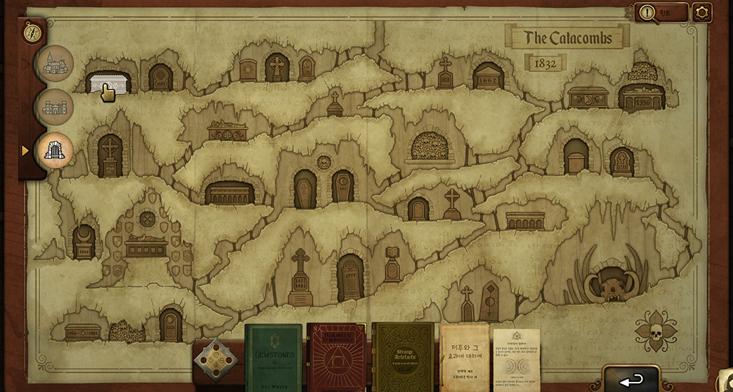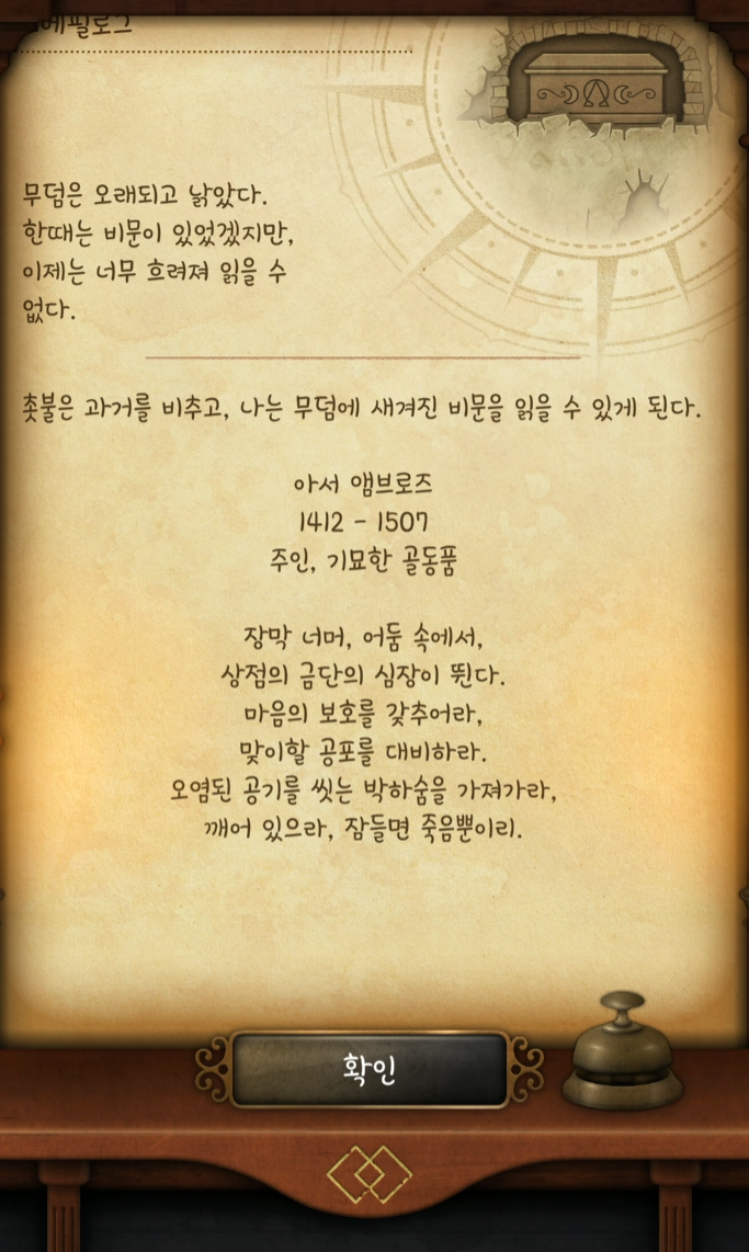 위의 시계 퍼즐을 풀면, 기괴한 느낌의 또 다른 퍼즐이 나옵니다. 골동품 세 개를 놓으면 해결될 것 같습니다. 한가운데 원에 이상한 기호가 그려져 있는데, 이 기호를 지하 묘지에서 볼 수 있습니다. 해당 지하묘지로 가면 비문이 흐려 저 읽을 수 없다고 합니다. 여기에 '캐릭의 양초'로 과거의 선명했던 비문을 읽어볼 수 있습니다.