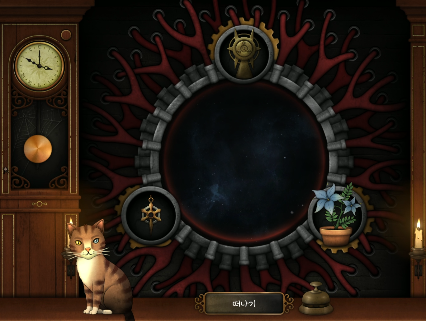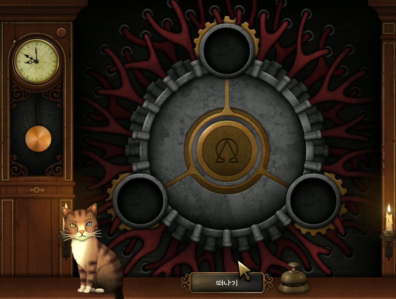 그럼 아주 익숙한 곳이 열리는데 놀랍게도 달의 모양을 중심으로 나무 톱니바퀴가 물려 있습니다. 일단 하던 대로 달의 모양에 맞게 시계추를 당긴 후 시계로 돌아가 보면- 시곗바늘 두 개가 제대로 작동하지 않는 것을 발견하게 될 겁니다. 이렇게 되면 두 개의 버튼은 어떤 것을 눌러야 하는지 유추해야 합니다. (짧은바늘과 가느다란 바늘의 규칙이 필요합니다)