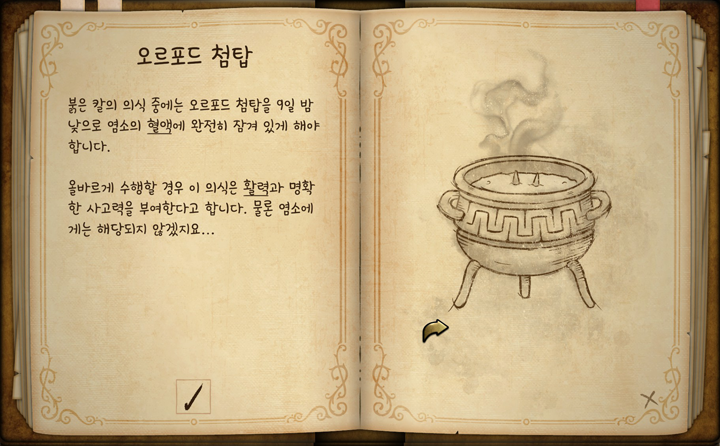 도감 페이지를 넘기다 보면 페이지 아래에 X 표시가 되어 있는 게 있습니다. 해당 아이템을 모두 찾아 선반 위에 올립니다. 바벨리아, 오르포드 첨탑, 주술 바늘입니다.