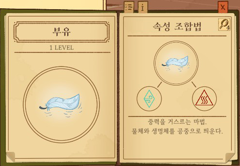 부유=공기+불 강화없음: 몸이 가벼워지는 1단계 강화: 몸이 떠오르는 2단계 강화: 자유롭게 비행하는 |