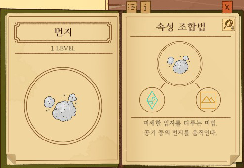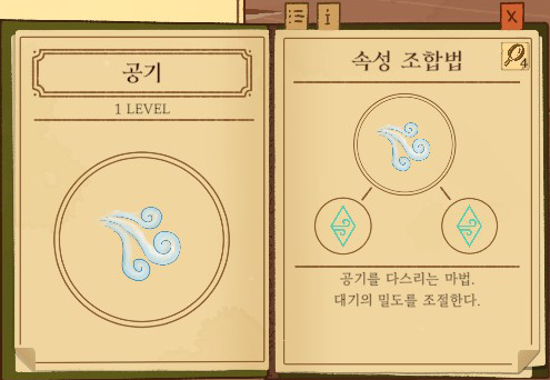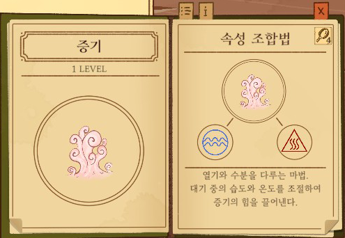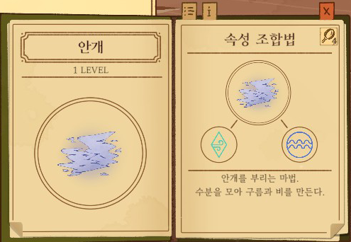 안개=공기+물 강화없음: 주변을 자욱하게 1단계 강화: 구름 2단계 강화: 비 |