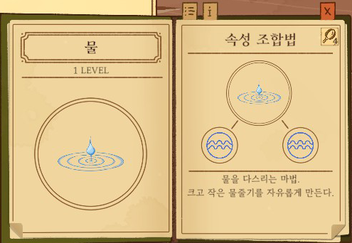 물=물+물 강화없음: 웅덩이 1단계 강화: 호수 2단계 강화: 강 |