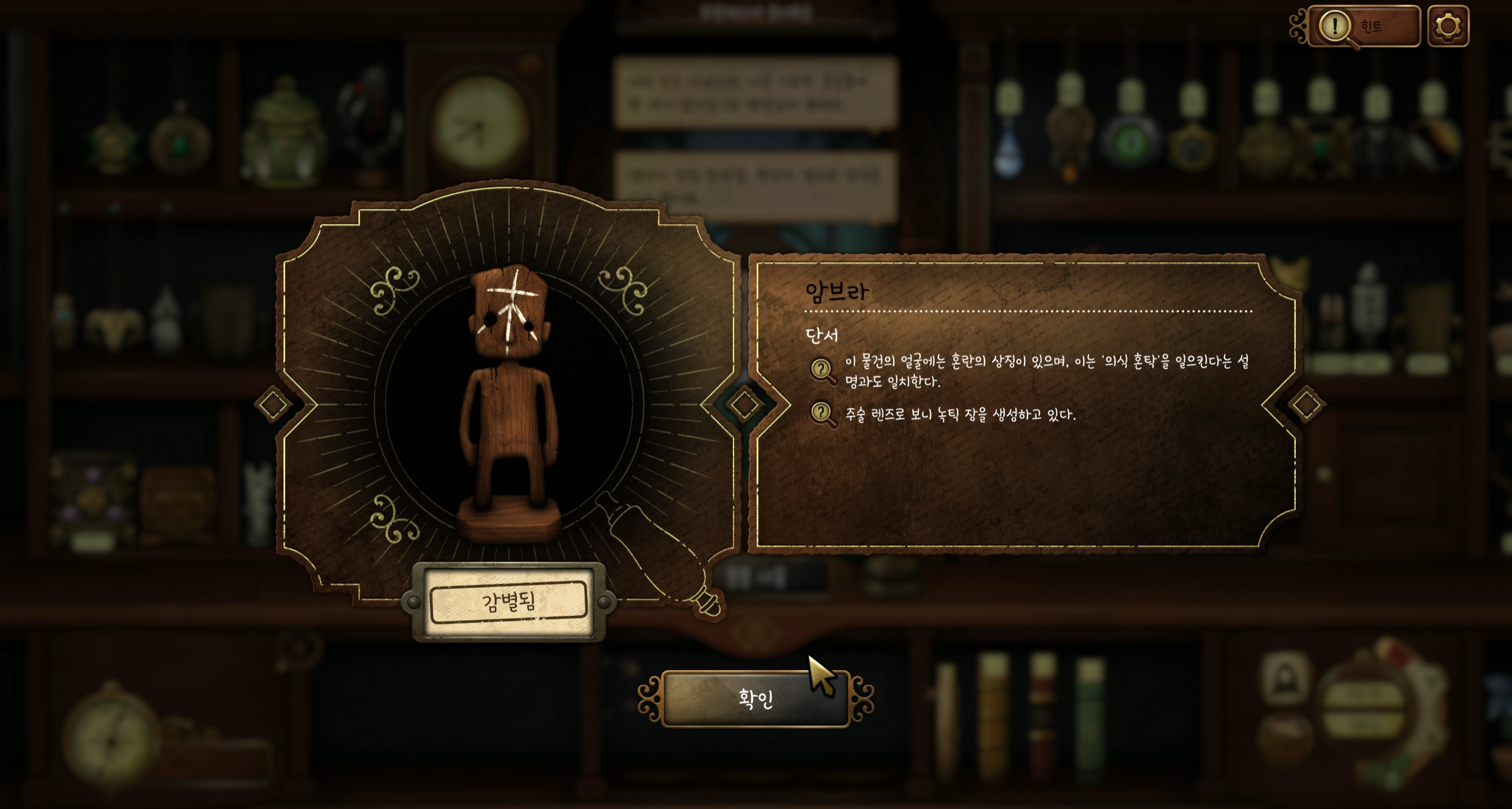 암브라는 녹틱 장을 생성한다고 합니다. 주술 렌즈를 열어 녹틱 장의 모양을 만들어 보면 시계 방향으로 돌아가는 소용돌이 모양이라는 것을 알 수 있습니다. 잠겨진 서랍장에서 해당 모양의 마법장을 나타내는 골동품을 찾으면 됩니다.