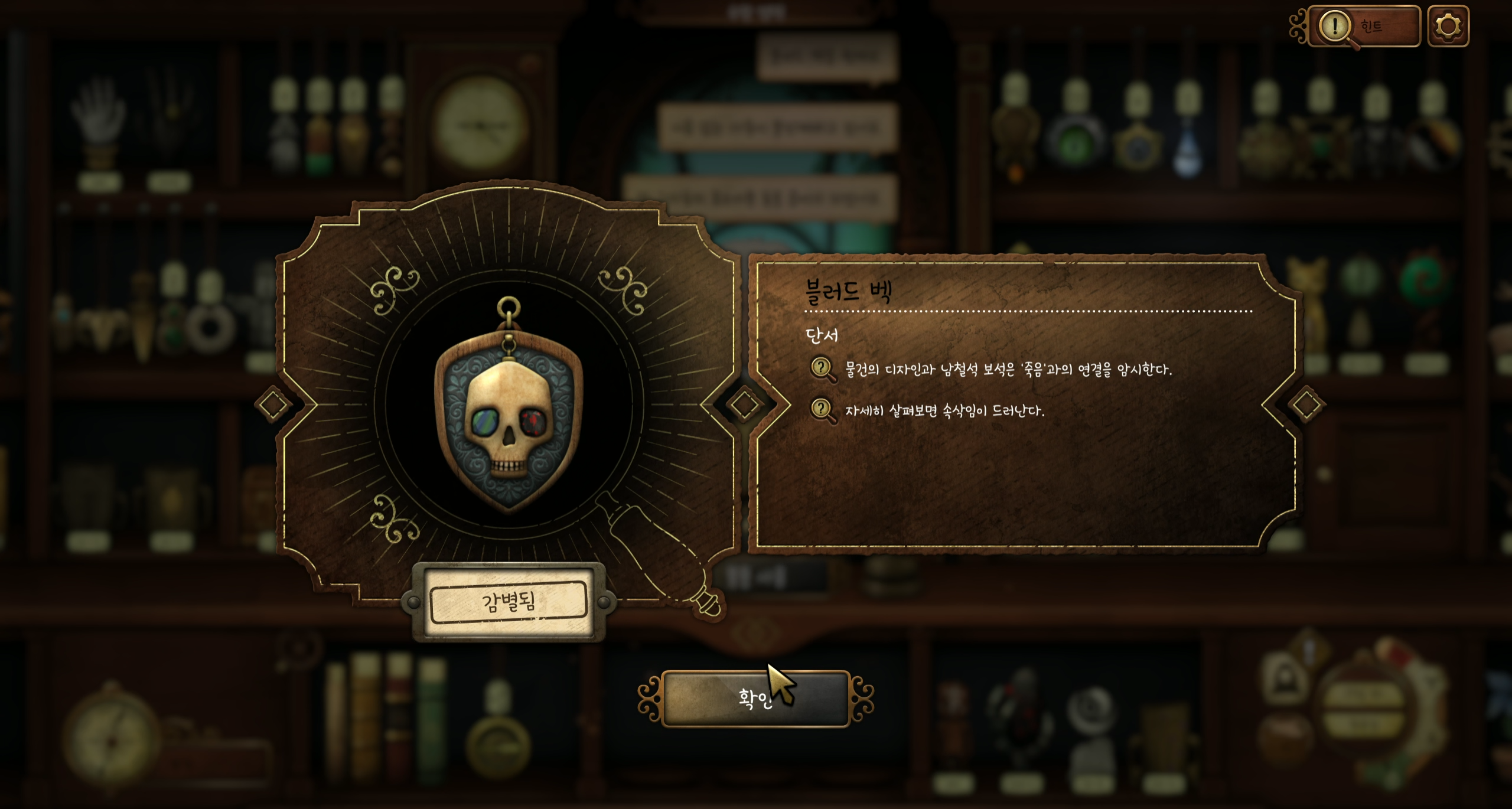 블러드 벡을 요청합니다. 죽은 자와 소통하는 데 사용할 수 있다 여겨졌다고 합니다. 죽음과 관련된 아이템을 추려봅시다. 혈석과 남철석을 눈에 박은 해골 펜던트가 보이시나요? 아이템에서 소리가 나오는지 확인해 봅시다.