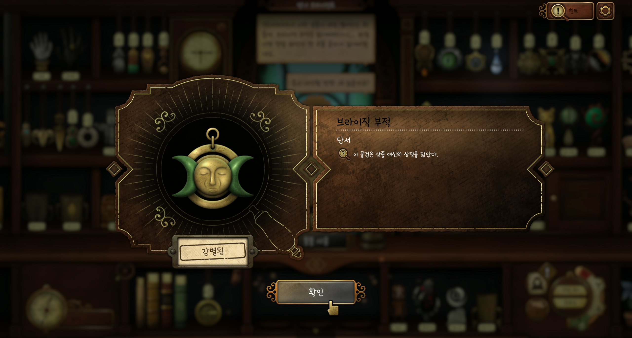 브라이직 부적을 잃어버려 대체품을 찾고 있습니다. 책에는 삼중 여신의 힘을 갖고 있다고 하니 기호책에서 삼중 여신을 찾아봅시다. 그와 비슷한 모양의 아이템을 찾으면 됩니다.