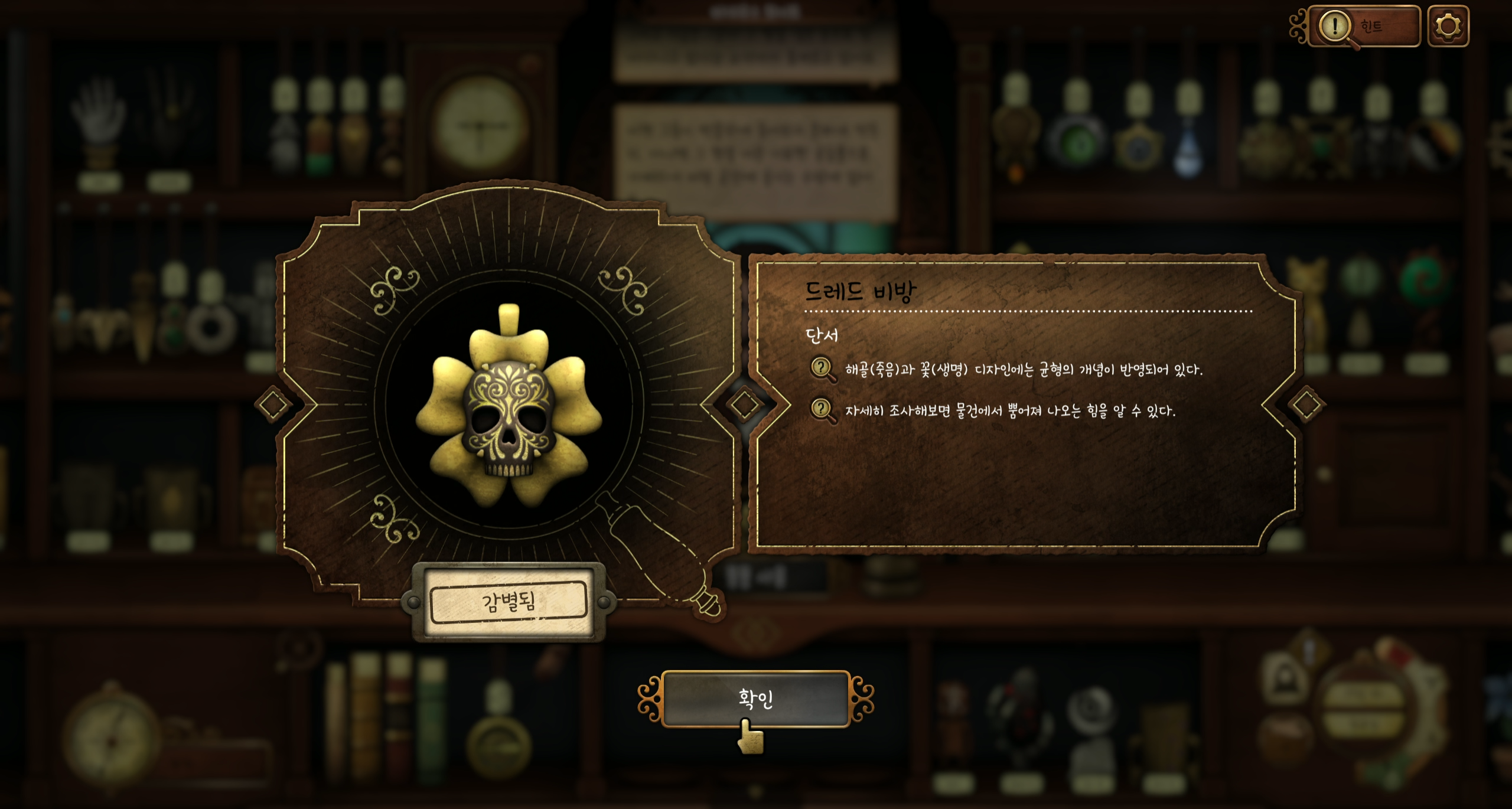 - 드레드 비방: 미묘하게 활력을 느낄 수 있으며 삶과 죽음의 균형을 나타낸다고 묘사되어 있습니다. 꽃과 해골이 묘사된 펜던트를 조사해봅시다. 참고로 게임 로딩 시 나오는 이미지가 바로 이 골동품입니다. (생존)