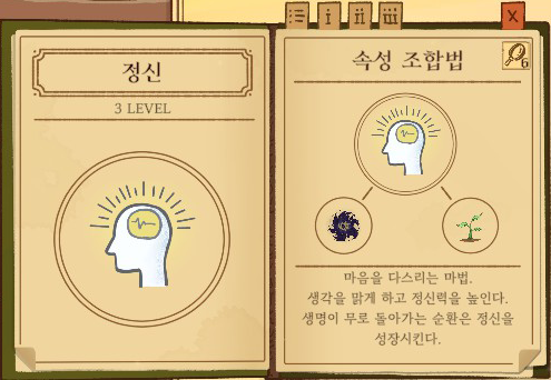 정신 = 공허 + 생장 강화없음: 집중력을 높임 1단계 강화: 잡념을 없앰 2단계 강화: 기억을 보존 |