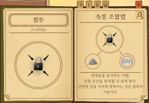 침투 = 돌 + 물 강화없음: 잠금장치 해제 1단계 강화: 얇은 틈으로 들어감 2단계 강화: 벽을 뚫는 마법 |