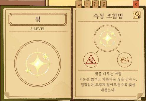 빛 = 불 + 아지랑이 강화없음: 주위를 밝게 1단계 강화: 아름다운 빛무리 2단계 강화: 무지개를 생성 |