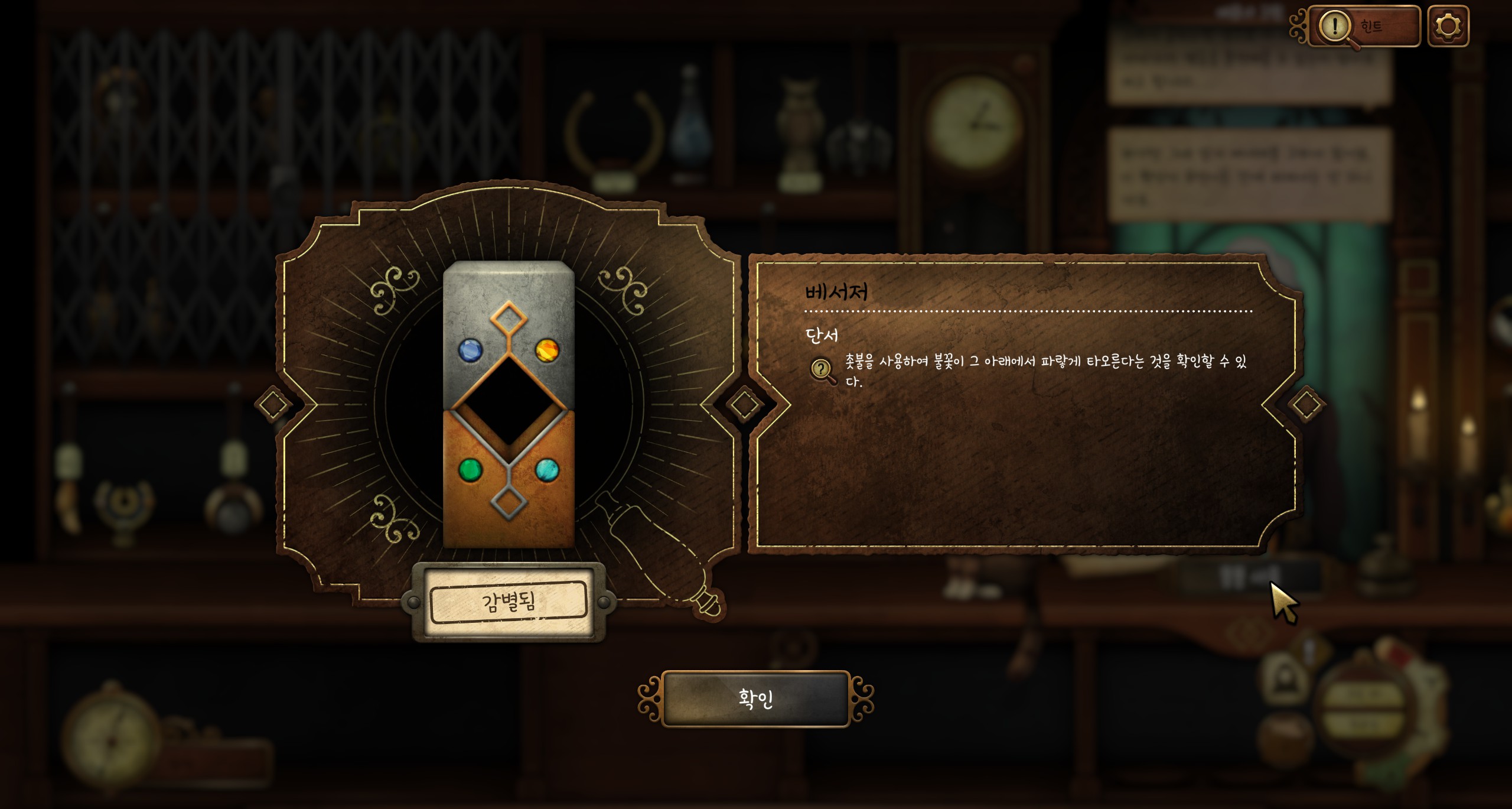 베서저를 요구합니다. 베서저는 불빛을 옅은 푸른색으로 바꿀 수 있습니다. 카운터의 촛불을 들어서 (클릭해서 움직일 수 있습니다) 각 골동품에 비추면 쉽게 찾을 수 있습니다.