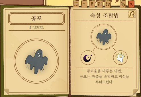 공포 = 어둠+정신 강화없음: 오싹하게 1단계 강화: 두려움에 떨게 2단계 강화: 가장 무서워하는 것을 보여주는 (공포감) |