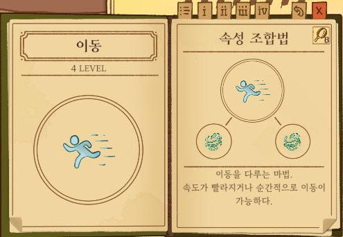 이동 = 바람+바람 강화없음: 이동 속도 증가 1단계 강화: 가시거리까지 이동 2단계 강화: 이동 포탈 생성 |
