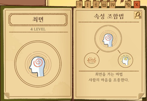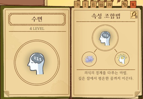 수면 = 안개+정신 강화없음: 졸음 1단계 강화: 깊은 잠 2단계 강화: 원하는 꿈 |