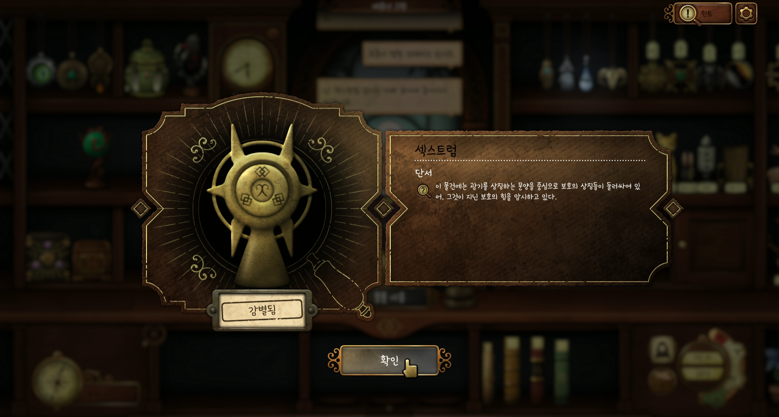 지하 묘지를 조사하겠다면서 섹스트럼을 찾습니다. 광기로부터 보호한다는 이 골동품은 광기와 보호의 문양이 새겨져 있습니다.