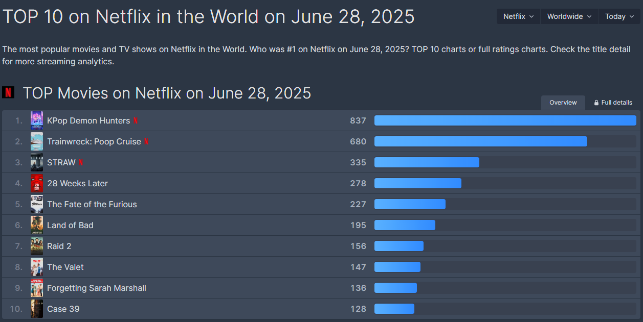 이미 iTunes에서는 1위를 하고 있었고, 스포티파이에서도 계속 순위권으로 올라가고 있습니다. K팝이 장르의 하나로 인식된 지 이미 오래되었기 때문에, OST자체가 거의 K팝 앨범으로 인식되고 있었습니다. 음악 전문 X(구. 트위터) 계정인 AboutMusic에 의하면 29일 기준 글로벌 스포티파이에서 가장 많이 스트리밍 된 K팝 곡이 순서대로 Golden, Your Idol, How It's Done, Soda Pop, What It Sounds Like였습니다. 또 다른 음악 전문 X 계정인 Pop Core에서는 미국 스포티파이 차트에 Top 10 안에 진입한 K팝 보이그룹이 방탄소년단과 사자보이즈 둘 뿐이라고 언급했습니다. 미국 애니메이션의 OST, 심지어 K팝인 음악이 전 세계 사람들을 사로잡고 있다는 방증입니다.