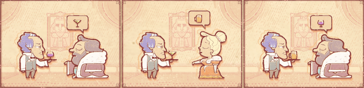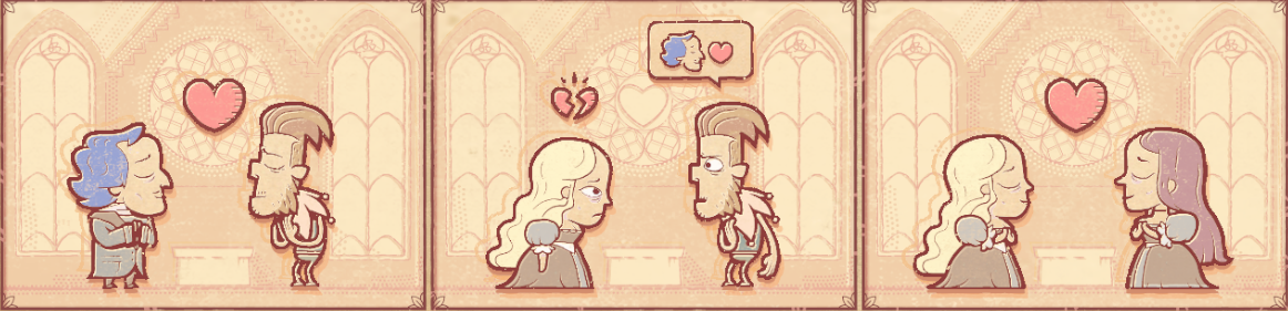 데모를 할 때부터 꼭 해보고 싶었던 게임, "Storyteller"입니다. 아기자기한 그림체로 퍼즐처럼 끼워 넣어 스토리를 넣어 만드는 겁니다. 그렇다고 자유롭게 스토리를 만들 수는 없습니다. 주제가 주어지고, 장소는 한정되어 있고, 등장인물들의 성격은 어느 정도 기본적인 성격이 있습니다. 예를 들어, 등장인물들은 남녀와 상관없이 사랑을 맺을 수 있지만, 여왕과 남작의 경우 특정 이벤트를 거치지 않으면 맺어질 수 없습니다. 집사는 항상 피에 굶주려 있는데, 고용주인 공작은 변덕쟁이이기 때문입니다. 이소벨은 질투가 있으며, 기사는 여왕에게 충성합니다. 이런 인물들을 가지고 큰 줄거리를 구성하는 게 이 게임의 주목적입니다.