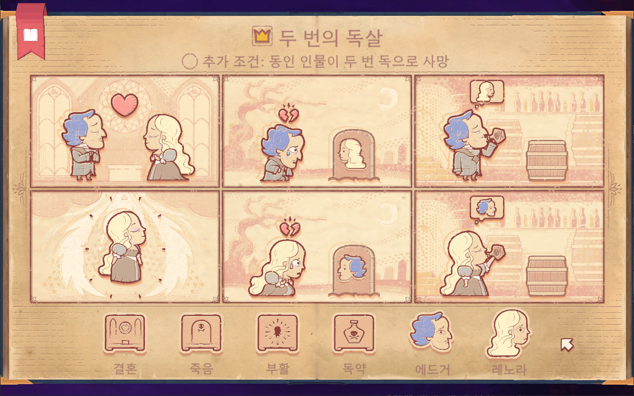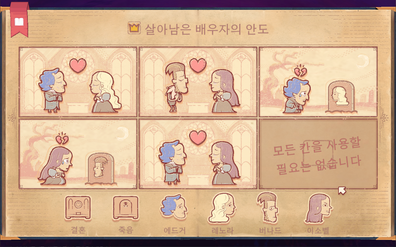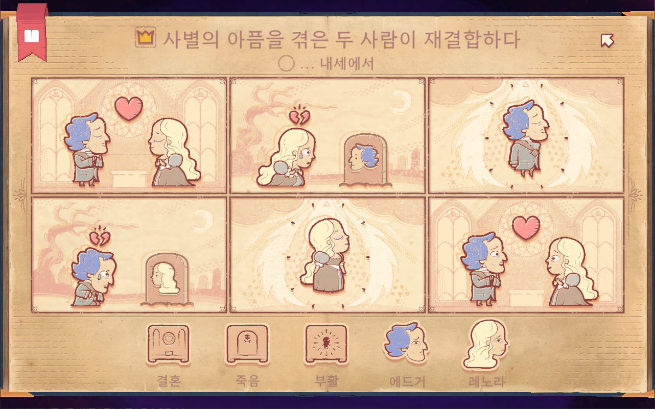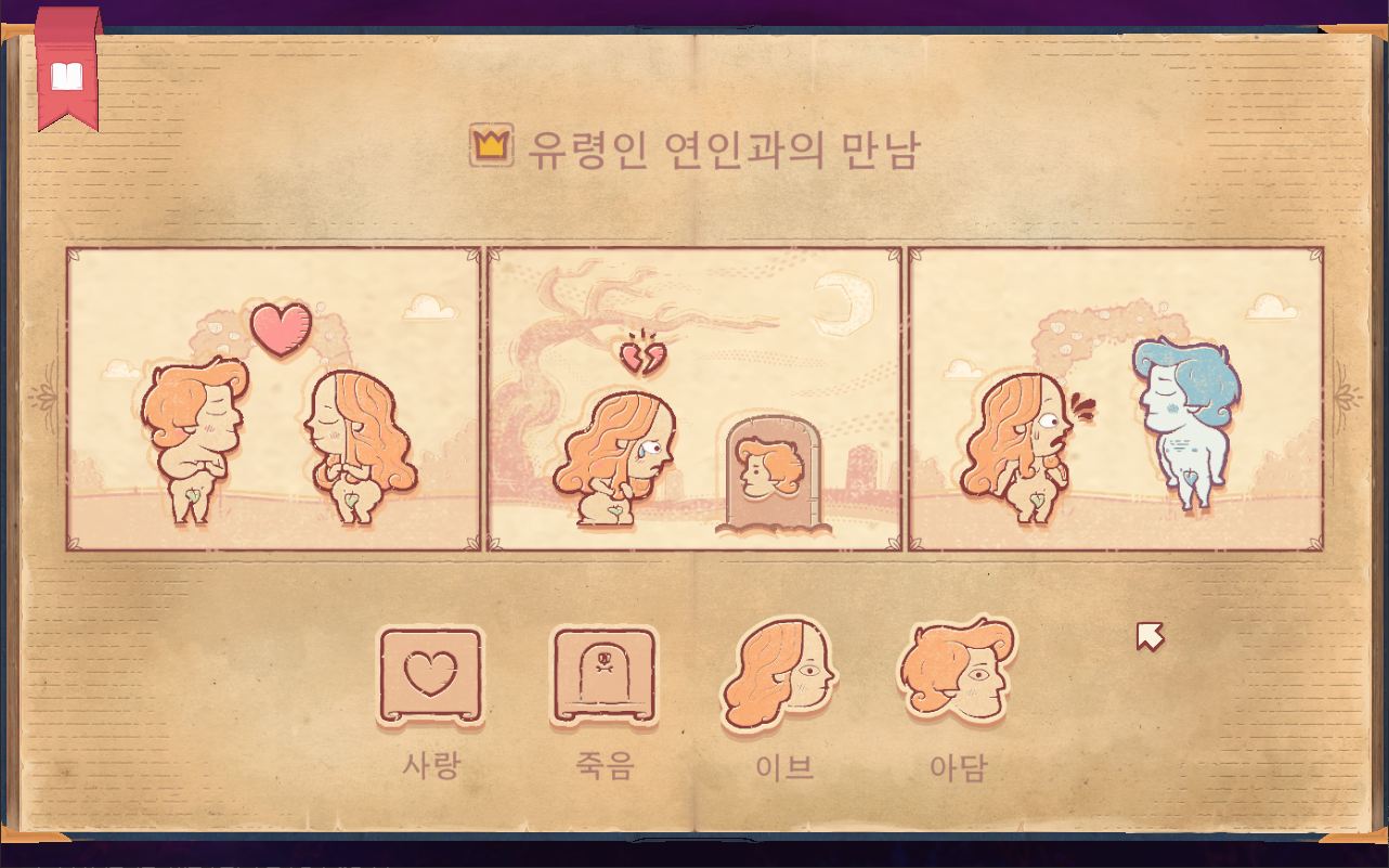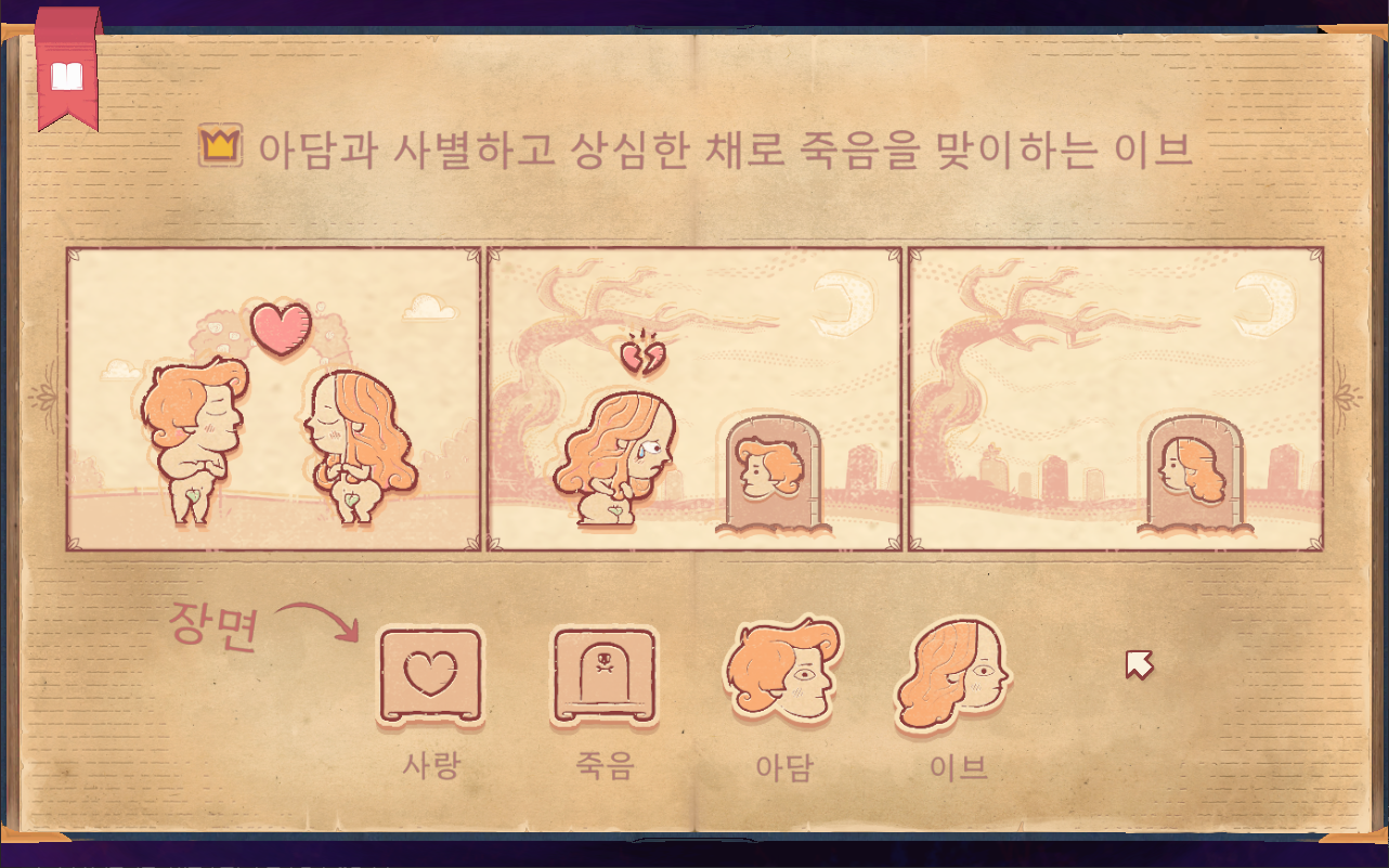 - 1장 : 삶과 죽음 - 튜토리얼 개념이므로 게임 진행 방식을 알려주는 장입니다. 1-1. 사랑 : 외로웠지만 사랑을 찾아 행복하게 죽음을 맞이하는 아담 1-2. 비탄 : 아담과 사별하고 상심한 채로 죽음
