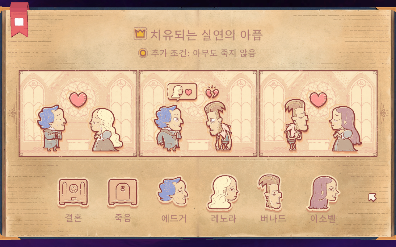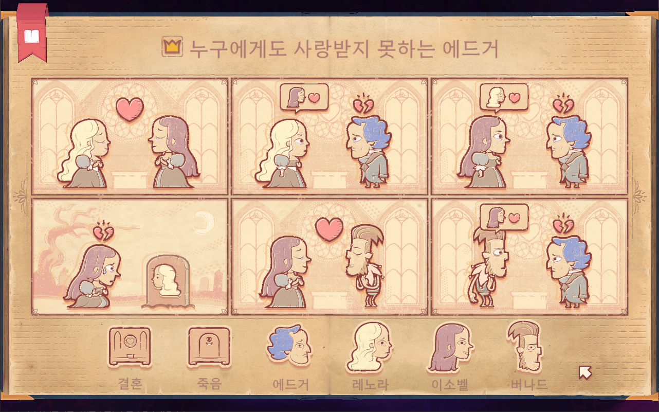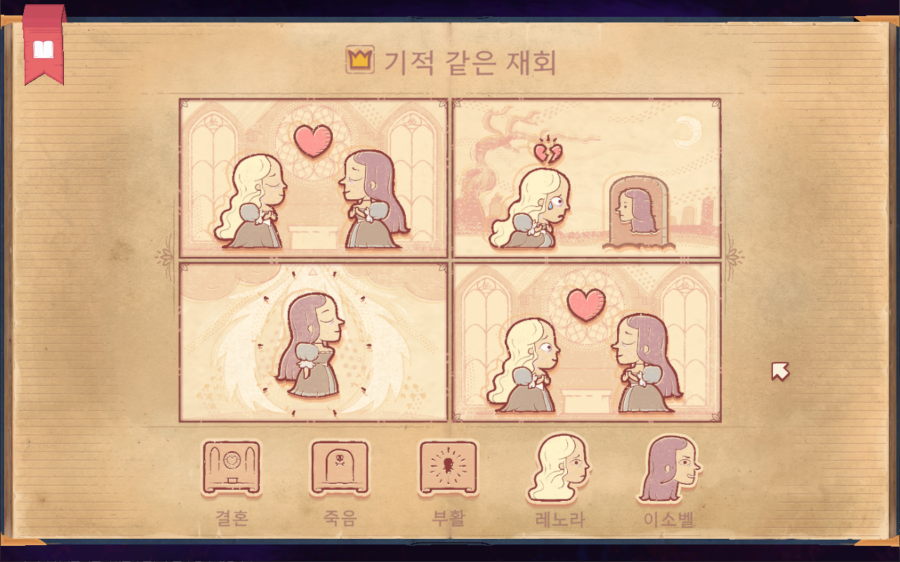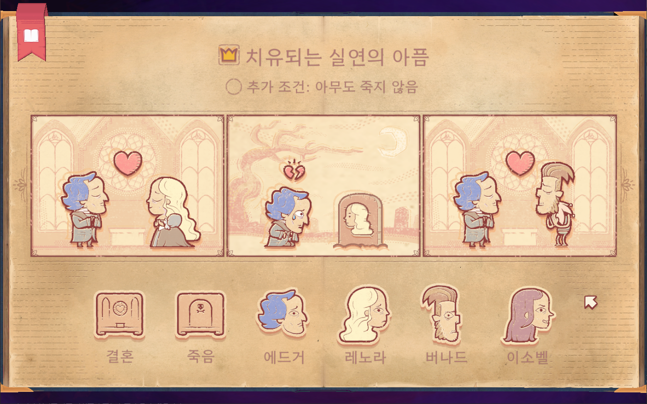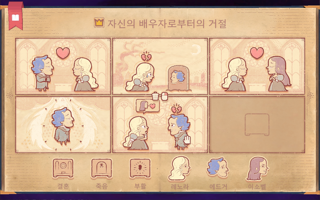 - 1장 : 삶과 죽음 - 튜토리얼 개념이므로 게임 진행 방식을 알려주는 장입니다. 1-1. 사랑 : 외로웠지만 사랑을 찾아 행복하게 죽음을 맞이하는 아담 1-2. 비탄 : 아담과 사별하고 상심한 채로 죽음
