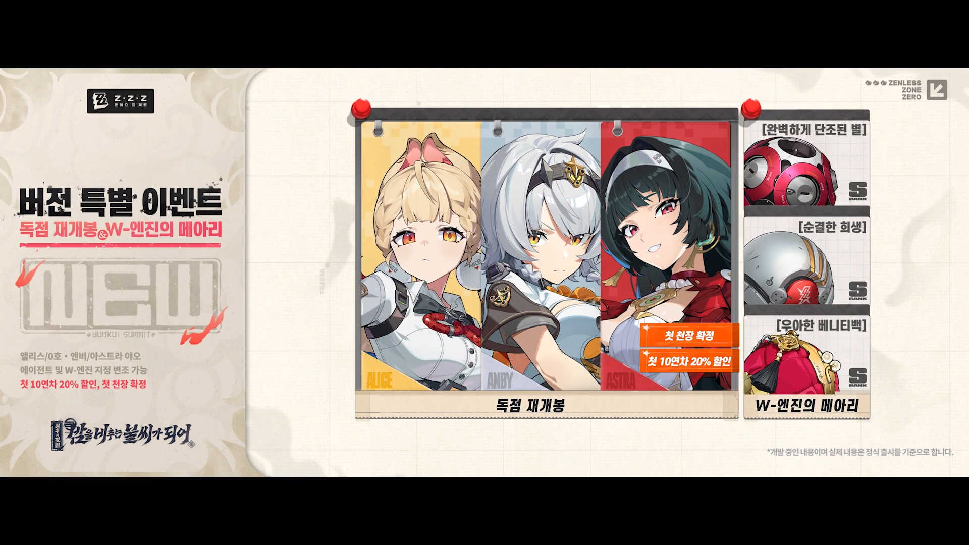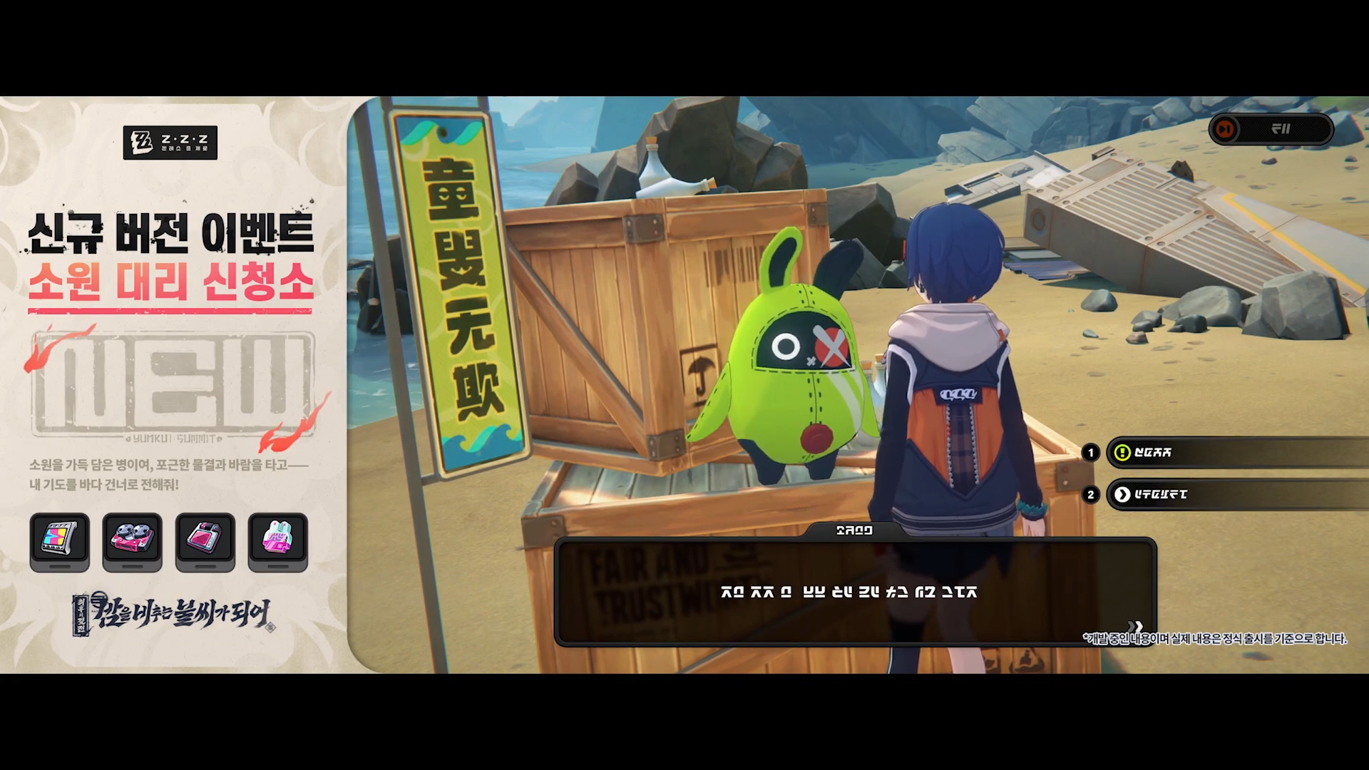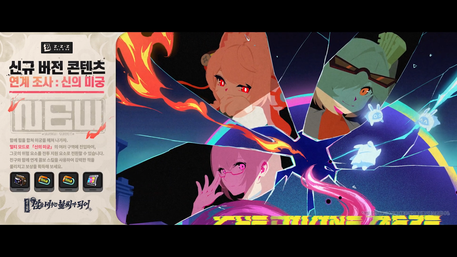 이 외의 다양한 업데이트는 2.5 버전 PV를 시청하시는 걸 추천드립니다. 특별 방송에서 류웨이가 직접 등판하여 설명할 정도로 ZZZ가 이번 업데이트에 힘을 많이 줬습니다.