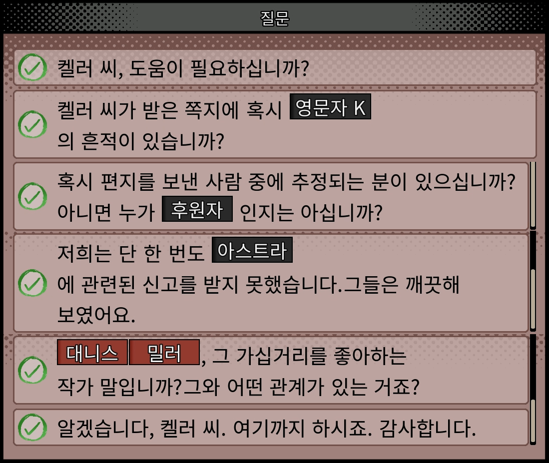 그 전에도 그녀는 줄곧 쪽지를(을) 받았는데, 쪽지에는 늘 영문자K가(이) 찍혀있었다.